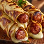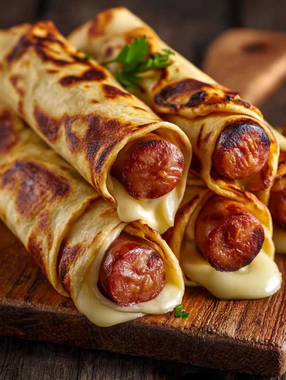 Diese herzhaften Hot Dogs in Tortilla-Teig bieten eine köstliche Kombination aus saftigen Würstchen, umhüllt von geschmolzenem Käse und einer leicht gebräunten, weichen Tortilla. Die goldbraun gebackene Hülle sorgt für eine angenehme Textur, die perfekt mit dem zartschmelzenden Käse und dem würzigen Hot Dog harmoniert. Ein unkompliziertes Gericht, das sowohl als Snack als auch als Hauptmahlzeit überzeugt.