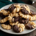 Spritzgebäck ist ein klassisches deutsches Weihnachtsgebäck, das für seine zarte Textur und seinen feinen Buttergeschmack geschätzt wird. Diese Plätzchen werden traditionell durch einen Fleischwolf oder eine Gebäckpresse geformt, was ihnen ihre charakteristischen Rillen und Formen verleiht. Nach dem Backen entwickeln sie eine leichte Knusprigkeit, die im Mund zergeht. Die hier gezeigten Varianten sind teilweise mit dunkler Schokolade überzogen oder beträufelt, was eine zusätzliche süße und leicht herbe Note hinzufügt und den reichen Buttergeschmack wunderbar ergänzt. Sie sind eine beliebte Ergänzung für jede festliche Kaffeetafel.