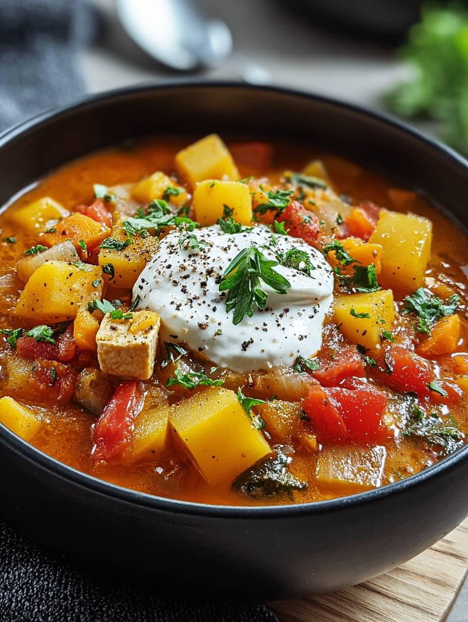 Herzhafter vegetarischer Gemüseeintopf mit Tofu.