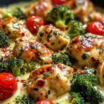 Dieses Gericht vereint zarte Hähnchenbruststücke mit frischem Brokkoli und saftigen Kirschtomaten in einer reichhaltigen, cremigen Soße. Abgerundet mit aromatischen Kräutern und sonnengetrockneten Tomaten, bietet es eine ausgewogene Mischung aus herzhaften und frischen Geschmacksnoten. Die Hähnchenstücke werden zunächst goldbraun angebraten und anschließend in der cremigen Soße mit dem Gemüse fertig gegart, was zu einem saftigen und geschmackvollen Ergebnis führt.