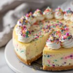 Ein Biss in diesen cremigen Funfetti Käsekuchen ist wie ein kleiner Urlaub für die Seele: eine Wolke aus zarter Vanille, durchsetzt mit fröhlichen Farbtupfern, die auf einem knusprigen Keksboden tanzen. Jeder Löffel ist ein Fest für die Sinne, süß, reichhaltig und unwiderstehlich.