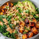 Gerade in unserer schnelllebigen Zeit suchen wir doch alle nach Rezepten, die nicht nur lecker, sondern auch gut für uns sind, oder? Und genau hier kommt unsere heutige Kreation ins Spiel: eine unglaublich befriedigende, **gesund einfach Airfryer Süßkartoffel Erdnuss Bowl knusprig**. Während die Süßkartoffeln in diesem Rezept im Backofen perfekt karamellisiert werden, ist die Idee einer schnellen, nahrhaften Bowl mit knusprigen Elementen oft auch mit dem Trend des Airfryers verbunden – eine moderne Art, unkompliziert zu kochen. Diese nahrhafte Schüssel vereint süße und herzhafte Aromen in einem ausgewogenen Gericht, das dich mit Sicherheit begeistern wird. Im Mittelpunkt stehen die karamellisierten, gerösteten Süßkartoffelwürfel, die auf einem Bett aus lockerem Reis und frischem Grünkohl angerichtet werden. Eine cremige, leicht würzige Erdnusssauce umhüllt die Zutaten, ergänzt durch die Frische von Avocado und den knackigen Biss gerösteter Erdnüsse. Frühlingszwiebeln und Sesam runden das Gericht geschmacklich und optisch ab und machen jede Gabel zu einem kleinen Glücksmoment. Diese Power-Bowl ist ein echtes Highlight für alle, die Wert auf Genuss und eine ausgewogene Ernährung legen.