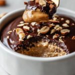 Diese Snickers Haferflocken über Nacht bieten eine köstliche Kombination aus cremigen Haferflocken, reichhaltiger Schokolade, salziger Erdnussbutter und knackigen Nüssen. Die Haferflocken werden über Nacht im Kühlschrank eingeweicht, wodurch eine samtige Textur entsteht. Am Morgen wird das Gericht mit einer glänzenden Schokoladenschicht, einem großzügigen Klecks Erdnussbutter und gehackten Nüssen verfeinert, die für eine harmonische Mischung aus süßen, salzigen und nussigen Aromen sorgen. Ein einfaches und nahrhaftes Frühstück, das ohne Kochen zubereitet wird.