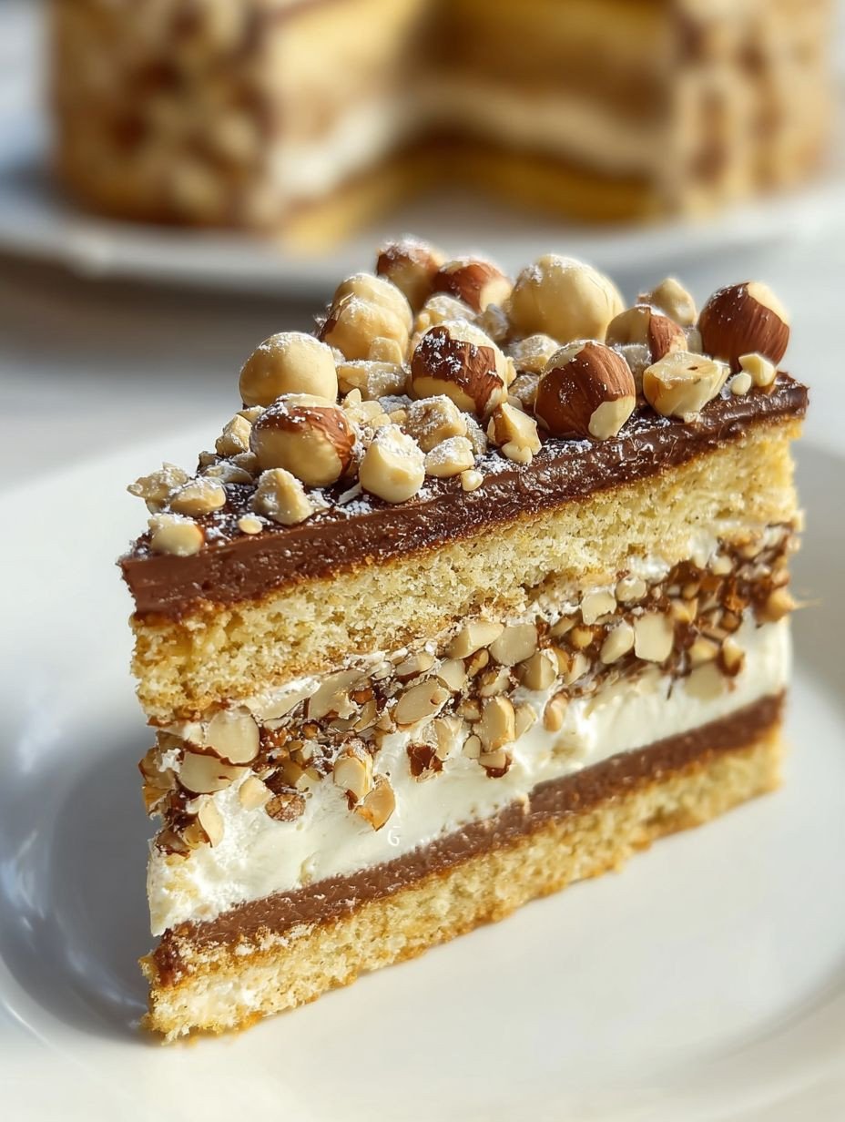 Diese Torte ist ein wahr gewordener Traum für alle Nuss- und Schokoladenliebhaber. Jeder Bissen bietet das perfekte Zusammenspiel aus dem luftigen Nuss-Biskuit, der reichhaltigen Nougatcreme, der zarten weißen Creme und dem herrlichen Knuspern der Haselnüsse. Es ist das ideale Dessert, um Freunde und Familie zu beeindrucken oder sich einfach selbst einen Moment puren Genusses zu gönnen. Sie werden staunen, wie mühelos dieser imposante Kuchen gelingt!