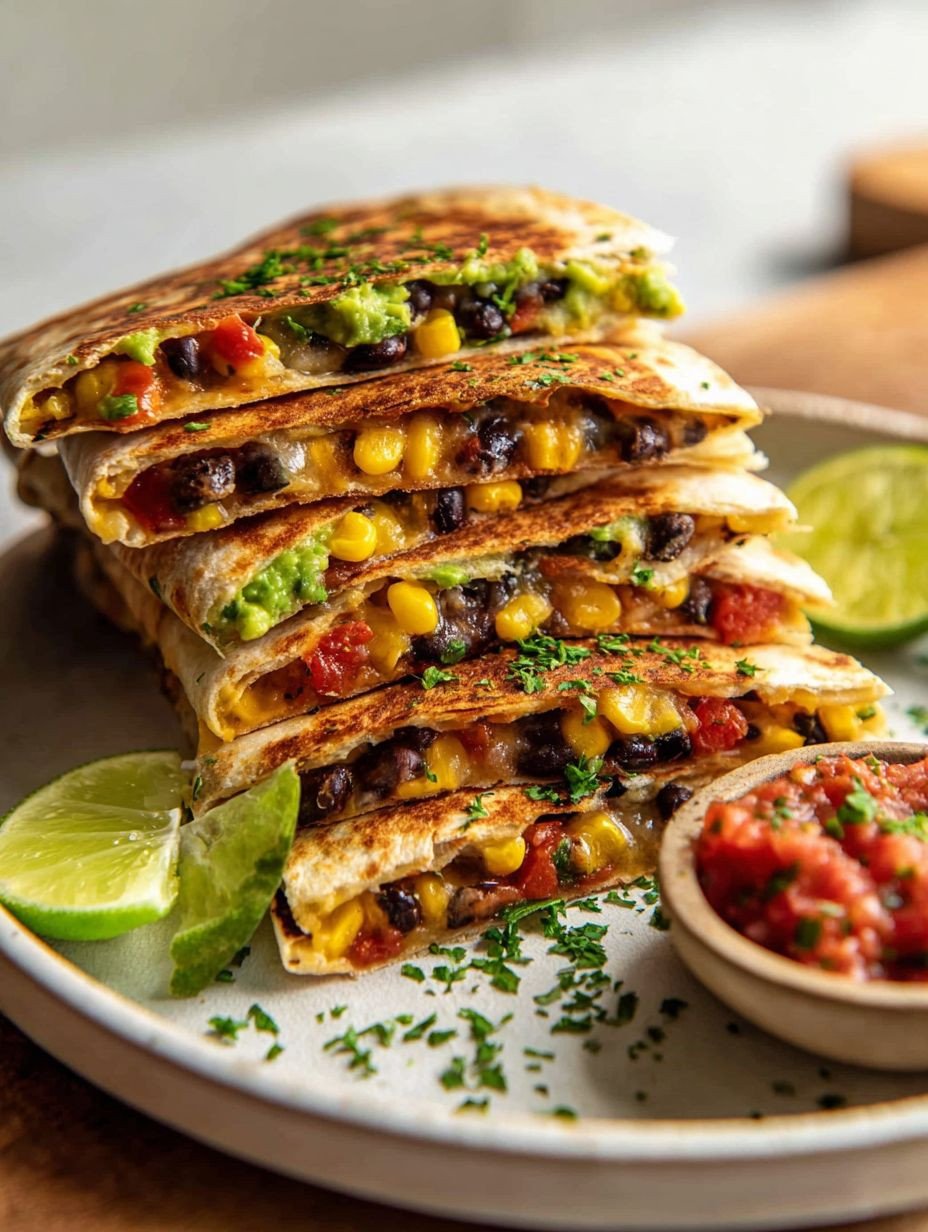 Diese veganen Quesadillas bieten eine köstliche Kombination aus herzhaften und frischen Aromen. Zwischen knusprig gebratenen Tortillas verbirgt sich eine cremige Füllung aus schwarzen Bohnen, süßem Mais, saftigen Tomaten und geschmolzenem veganen Käse. Abgerundet wird das Gericht mit frischer Guacamole und einem Hauch von Koriander, was für eine ausgewogene Textur und einen lebendigen Geschmack sorgt. Die Zubereitung in der Pfanne verleiht den Tortillas eine goldbraune Farbe und eine angenehme Knusprigkeit.