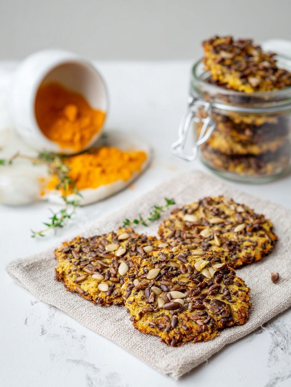 Diese knusprigen Cracker bieten eine nahrhafte und geschmackvolle Option für einen Snack oder als Beilage. Sie werden aus einer Mischung von Leinsamen, Sonnenblumenkernen und Kürbiskernen zubereitet, die ihnen eine reichhaltige Textur und einen erdigen Geschmack verleihen. Eine feine Note von Kurkuma sorgt für eine subtile Würze und eine ansprechende goldene Farbe. Die Cracker werden im Ofen gebacken, um ihre charakteristische Knusprigkeit zu entwickeln, und sind ideal zum Dippen oder Purgenießen.