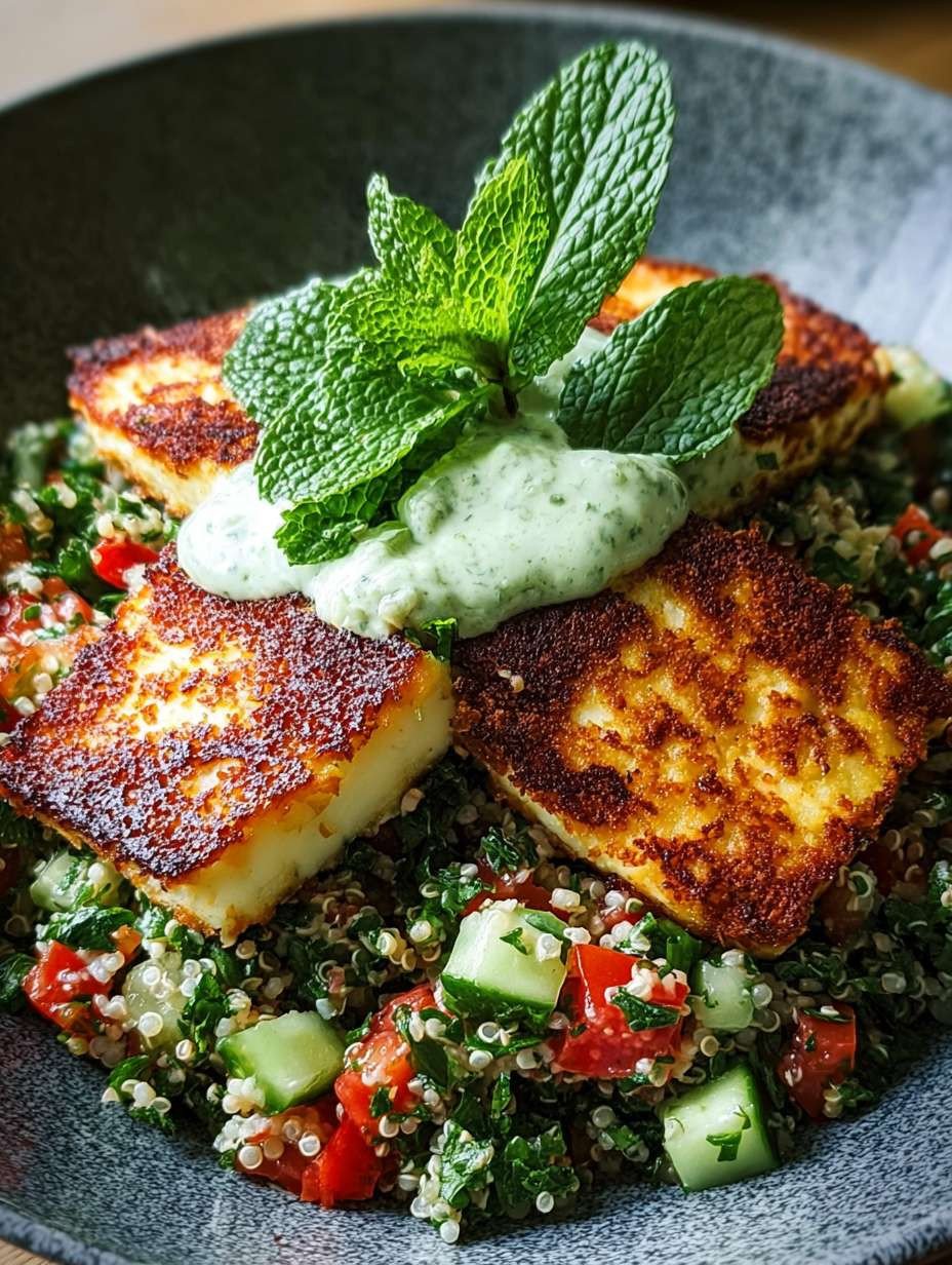 6. **Anrichten:** Den Quinoa-Tabbouleh auf Tellern anrichten. Die gebratenen Halloumi-Stücke darauflegen und mit einem Löffel des Minz-Joghurt-Dressings beträufeln. Mit frischen Minzblättern garnieren und sofort servieren.