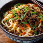 Stellt euch vor: Ein Duft von würzigem Rinderhackfleisch, kombiniert mit der Süße von Ingwer und der herzhaften Tiefe von Sojasauce, erfüllt eure Küche. Dann der erste Bissen: zarte Udon-Nudeln, umhüllt von einer reichhaltigen Sauce, knackige Karotten und ein Hauch Frühlingszwiebel – ein Fest für die Sinne, das auf eurer Zunge tanzt.