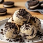 Diese cremigen Bällchen vereinen den klassischen Geschmack von Oreo-Keksen mit einer zarten Frischkäsebasis. Die Textur ist weich und geschmeidig, durchzogen von knusprigen Keksstückchen und gekrönt mit feinen Keksstreuseln. Sie werden ohne Backen zubereitet und anschließend gekühlt, um ihre feste Konsistenz zu erhalten.