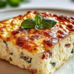 Dieser herzhafte Eierauflauf präsentiert sich mit einer wunderbar goldbraunen, leicht knusprigen Käsekruste, die einen cremigen und luftigen Eierkern umschließt. Im Inneren vereinen sich zarter Spinat und aromatische getrocknete Tomaten zu einem ausgewogenen Geschmackserlebnis. Das Gericht wird im Ofen gebacken, wodurch es eine gleichmäßige Textur und eine appetitliche Bräunung erhält. Es ist eine nahrhafte und sättigende Mahlzeit, die sowohl warm als auch kalt genossen werden kann.