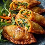 Diese knusprigen Gemüsetaschen präsentieren sich mit einer goldbraunen, zarten Hülle, die eine frische und farbenfrohe Füllung aus juliennierten Karotten, knackiger Gurke und zartem Spinat umschließt. Durch das Frittieren erhalten sie eine unwiderstehlich knusprige Textur, während die Gemüsefüllung ihren Biss behält. Abgerundet wird das Gericht durch eine leichte Würze und gerösteten Sesam, der für eine nussige Note sorgt.
