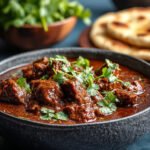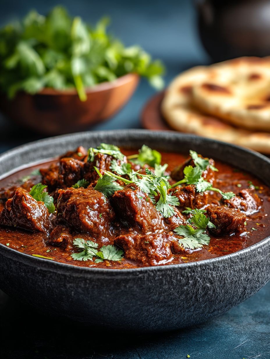 Die Luft ist erfüllt von einem betörenden Tanz aus Kreuzkümmel, Ingwer und dem warmen Hauch von Kardamom. Zartes Rindfleisch schmiegt sich in eine tiefrote, sämige Sauce, ein Duft, der sofort die Seele wärmt und zum Genießen einlädt.