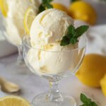 Es ist ganz normal, dass selbstgemachtes Eis direkt aus dem Gefrierschrank sehr fest ist, da es keine Stabilisatoren wie industriell hergestelltes Eis enthält. Wenn Ihr Zitroneneis nach dem Gefrieren zu hart ist, um es leicht zu portionieren, nehmen Sie es einfach für einige Minuten vor dem Servieren aus dem Gefrierschrank und lassen Sie es bei Raumtemperatur leicht antauen. Fünf bis zehn Minuten reichen meistens aus, damit das Eis die perfekte Konsistenz erreicht, um es mit einem Portionierer zu Kugeln zu formen. Anschließend können Sie es nach Belieben garnieren und genießen.