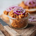 Dieses vegane Mett aus Reiswaffeln ist eine herzhafte und ansprechende Alternative zum traditionellen Mett. Es präsentiert sich in einer appetitlichen rötlich-braunen Farbe und einer feinen, streichfähigen Textur. Der Geschmack ist würzig und umami-reich, mit einer leichten Schärfe von Zwiebeln und einer subtilen Würze von Gewürzen. Die Zubereitung erfolgt ohne Kochen, indem die Zutaten zu einer homogenen Masse verarbeitet werden. Serviert wird es klassisch mit frischen Zwiebelringen, die für eine knackige Textur und eine frische Note sorgen.