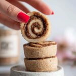 - **Ummanteln:** In einer kleinen Schale Rohrzucker und Zimt vermischen. Die gekühlte Rolle in etwa 1,5 bis 2 cm dicke Scheiben schneiden. Jede Zimtschnecke von allen Seiten in der Zimtzuckermischung wälzen.